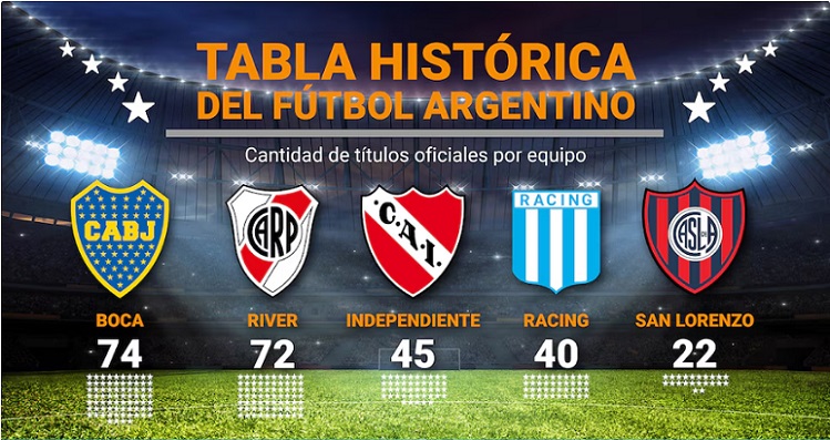 En lo que respecta a la tabla general de títulos de equipos del fútbol argentino, incorporando títulos de Liga, Copas Nacionales, Copas Internacionales y viejas Copas Rioplatenses; todos logros oficiales y de máxima categoría de la época amateur y profesional, Boca Juniors sigue dominando en el primer escalón: suma 74, dos más que River Plate y muy lejos de los otros grandes como Independiente (45), Racing Club (40) y San Lorenzo (22).