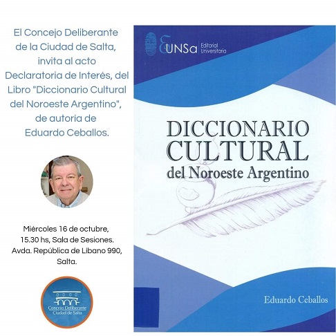 Letras de Fuego / Noticias. El escritor, periodista y gestor cultural salteño Eduardo Ceballos sigue cosechando reconocimientos y galardones. En esta ocasión el Concejo Deliberante de Salta, declarará de Interés a su “Diccionario Cultural del Noroeste Argentino”.