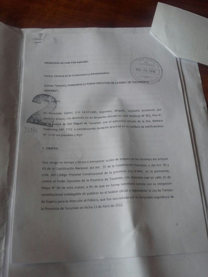 Esta mañana, el legislador Fernando Valdez se apersonó anta la Cámara en lo Contencioso y Administrativo para presentar un recurso de amparo a fin de que el gobierno provincial le otorgue un número y publique la Ley de trato digno al consumidor. “Es inaudito que un legislador deba recurrir a la Justicia para obligar al Poder Ejecutivo a cumplir con la manda constitucional que tiene de hacer operativa una norma que la legislatura sancionó hace un año y tres meses y que considera trato indigno las largas filas y colas que los tucumanos tienen que hacer en distintas dependencias públicas y privadas”, detalló.