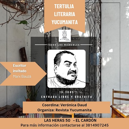 Letras de Fuego / Noticias. Este miércoles 27 de marzo, de 19.30 a 21.30, en la Peña El Cardón, Revista Yucumanita presentará al poeta talitense Marx Bauzá en la tertulia literaria que se desarrolla todos los miércoles con un autor distinto.