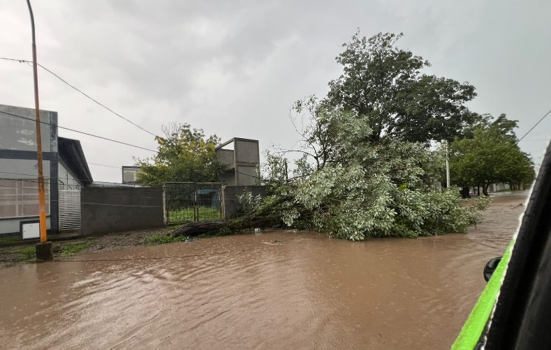 La fuerte tormenta fue precedida y acompañada por violentas ráfagas de viento, que provocaron, además de los anegamientos, caída de árboles que a su vez, arrastraron parte del tendido eléctrico.