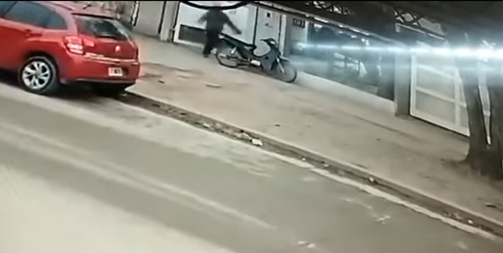 El sujeto, que se movilizaba en una motocicleta y vestía un buzo gris, dejó estacionado el rodado en la puerta del establecimiento, tras lo cual accedió al interior del predio, todo lo cual fue grabado por una cámara de seguridad ubicada en la acera de enfrente.