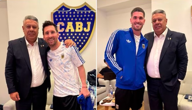 Dos fotos. En la izquierda, Chiqui Tapia junto a Lionel Messi frente a un escudo de CABJ. En la derecha, Chiqui Tapia posa con Rodrigo De PaulLas imágenes que posteó Claudio “Chiqui” Tapia durante la madrugada, después de las declaraciones de Rodrigo De Paul. Allí se lo ve junto al propio mediocampista y con Lionel Messi (@tapiachiqui)