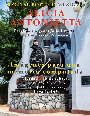- “Imágenes para una memoria computada”, de Alicia Antonietta. Sala Lazarte, Lavalle 145, a las 20.30. Recitado y órgano: Maestro Julio Lazarte. Violín: Gerardo Solórzano.