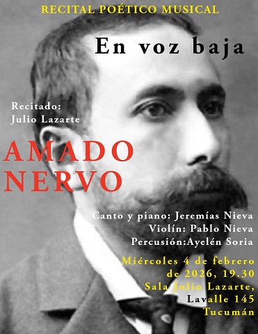 - “En voz baja”, Amado Nervo. Sala Lazarte, Lavalle 145, a las 19.30. Recitado: Maestro Julio Lazarte. Canto y piano: Jeremías Nieva. Violín: Pablo Nieva. Percusión: Ayelén Soria.