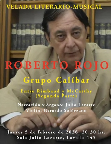 - “Entre Rimbaud y Mc Carthy” (Segunda Parte), de Roberto Rojo. Ciclo Grupo Calíbar. Sala Lazarte, Lavalle 145, a las 20.30. Narración y órgano: Maestro Julio Lazarte. Violín: Gerardo Solórzano.