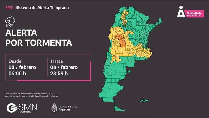 Las zonas que están bajo alerta amarilla por tormentas son todo Tucumán, también Jujuy, Salta, Córdoba, Mendoza, Neuquén, La Pampa, Buenos Aires, San Luis, San Juan y La Rioja. En estas tres últimas la advertencia asciende a color naranja. Esto significa que “se esperan fenómenos meteorológicos peligrosos para la sociedad, la vida, los bienes y el medio ambiente”, según detalla el organismo nacional.