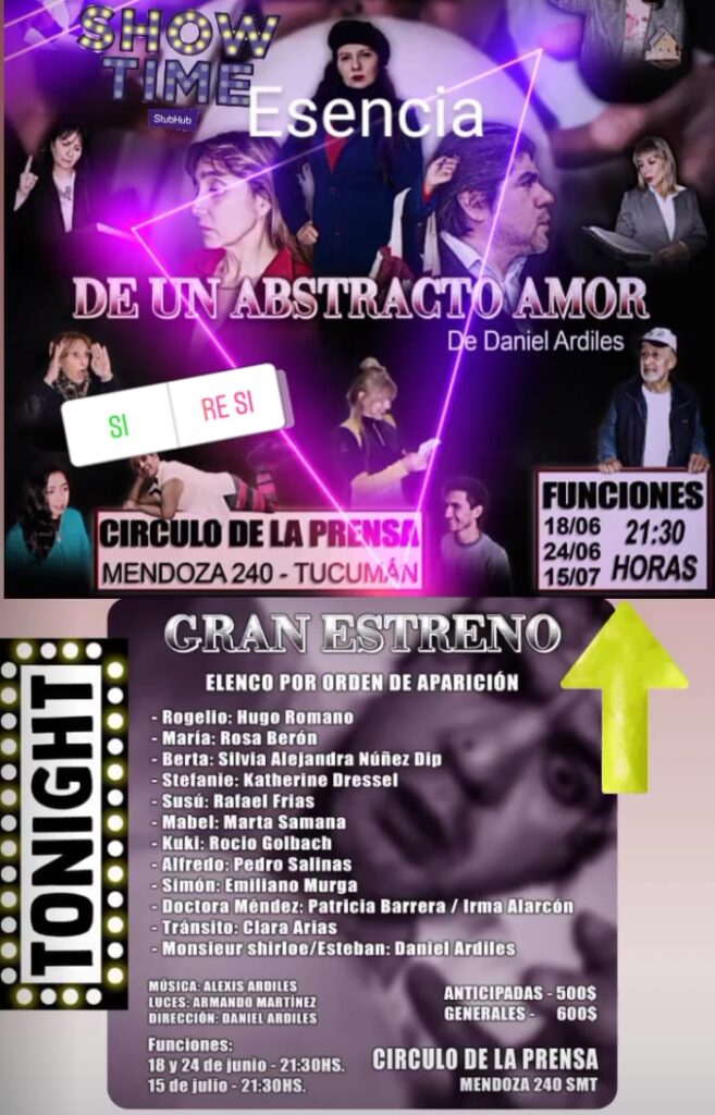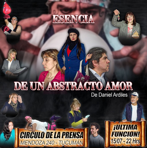 La obra teatral “Esencia de un amor abstracto” tendrá su última función este viernes, a las 22, en el Círculo de la Prensa, en calle Mendoza 240 de San Miguel de Tucumán. La puesta cuenta con la dirección de Daniel Ardiles.