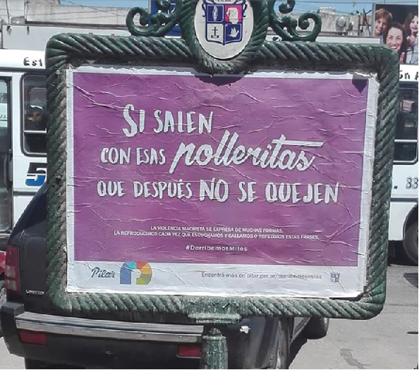 “Si le pega y ella se queda es porque le gusta” o “si usan esas polleritas, que después no se quejen” son algunas de las frases que podían observarse en los carteles instalados en la vía pública. Debajo de la expresión y en una letra pequeña aparecía la aclaración que buscaba “derribar mitos” y rechazar los dichos machistas que finalmente quedaron más y mejor instalados que la campaña que intentaba acabar con ellos.