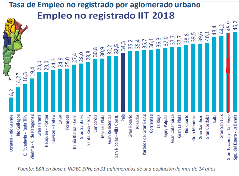 El NOA con el 42,6%, y Cuyo con el 40,3%, se encuentran entre las regiones con mayor porcentaje de empleo no registrado. Entre los aglomerados que sufren este flagelo y el descontrol de las entidades que deben velar por la seguridad de los trabajadores está el Gran San Miguel de Tucumán. Según, el informe de E&R, las mayores tasas de empleo en negro se encuentran en Santiago del Estero – principalmente en La Banda, en el Gran Tucumán – con Tafí Viejo a la cabeza y el Gran San Luis.