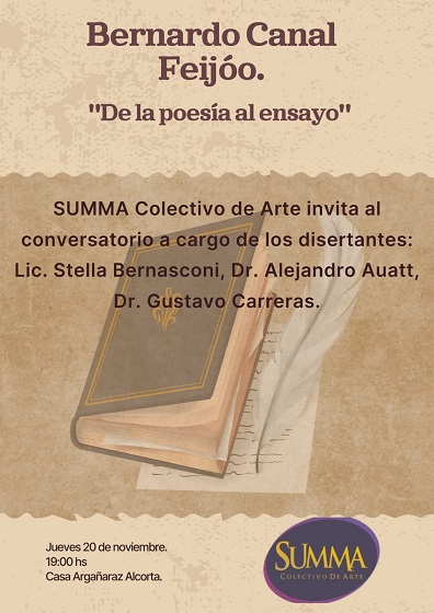 SUMMA Colectivo de Arte invita a los interesados en participar del conversatorio Bernardo Canal Feijóo “De la poesía al ensayo”, que contará con la disertación de la licenciada Stella Bernasconi, y los doctores Alejandro Auatt y Gustavo Carreras.