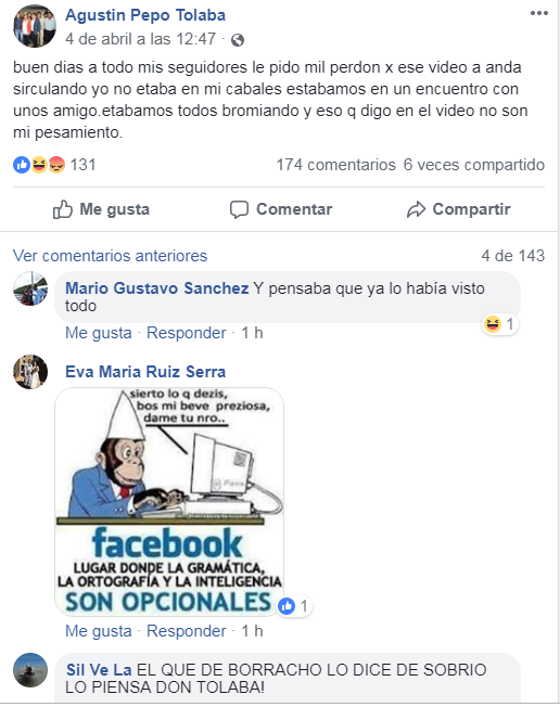 Tolaba publicó textualmente: “buen dias a todo mis seguidores le pido mil perdon x ese video a anda sirculando yo no etaba en mi cabales estabamos en un encuentro con unos amigo.etabamos todos bromiando y eso q digo en el video no son mi pesamiento.”