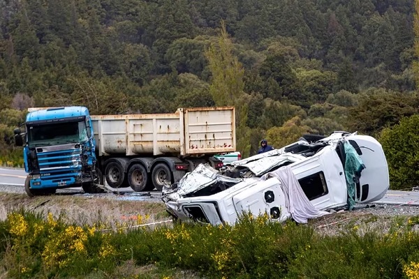 Por el choque, la camioneta que transportaba a los turistas quedó volcada sobre uno de sus lados y al costado del camino. El camión, por su parte, quedó sobre sus ruedas pero en la banquina y con el acoplado cruzado sobre el asfalto de la ruta.