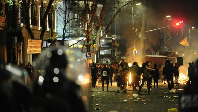 Casi dos horas después del final de la masiva movilización por Santiago Maldonado, la Avenida de Mayo se convirtió en escenario de graves incidentes entre un pequeño grupo de manifestantes y la Policía. Hubo más de 20 heridos, al menos 23 detenidos y serios destrozos, tanto en edificios como en el mobiliario urbano.