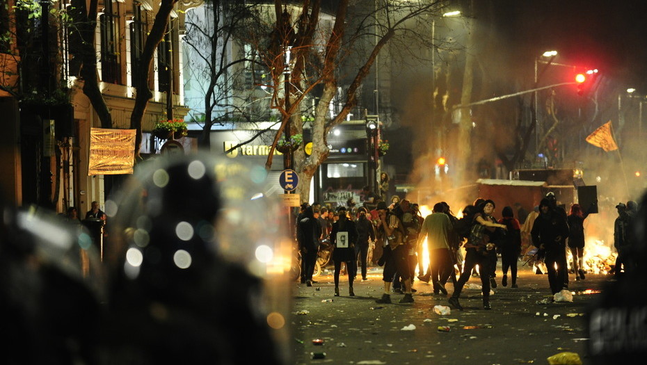 Los manifestantes utilizaron los contenedores de basura como improvisadas barricadas, en medio de fogatas y miradas de asombro de la gente que disfrutaba de la noche templada y se encontró -por sorpresa- en medio de los incidentes.