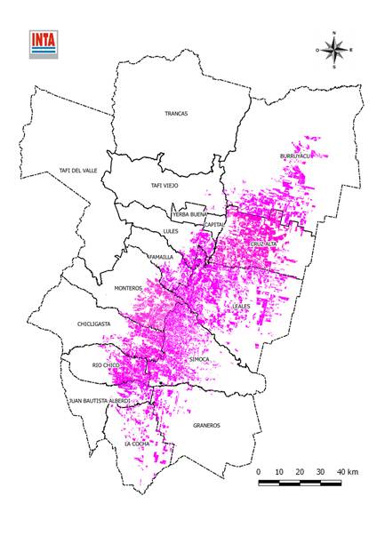 La cartografía digital obtenida permitió observar la distribución del cultivo en la provincia a nivel departamental: