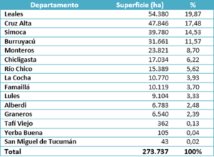 Respecto al año 2017, Leales (-7%), Cruz Alta (-3%), Burruyacú (-14%) y Chicligasta (-12%) mostraron una disminución en la superficie plantada con el cultivo. Mientras, Simoca (+3%), Famaillá (+2%), La Cocha (+9%) y Alberdi (+6%) registraron un incremento.