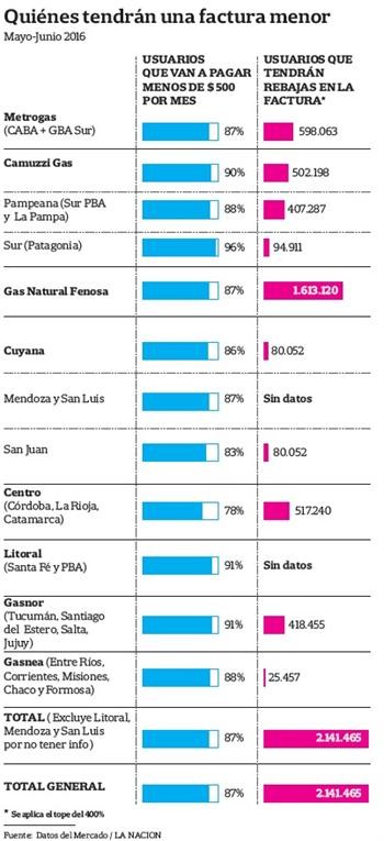 Los usuarios que recibirán las rebajas se distribuyen de forma relativamente parecida en toda la geografía argentina. Entre los clientes de Metrogas, la mayor distribuidora de gas del país, que atiende a la Capital Federal y a la zona sur de la provincia de Buenos Aires, habrá más de 598.000 familias a las que se le aplicará la rebaja, mientras que en la zona de Camuzzi (atiende la región pampeana y el sur del país) se les bajará el precio del gas a más de 502.198 usuarios.