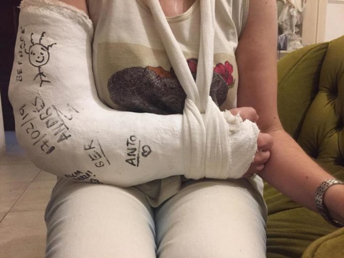 Amira Juri tiene enyesado el brazo derecho. Y muestra que su pie izquierdo, además de lastimado y presenta una inflamación. Ese es el saldo que dejó en su cuerpo el ataque al que la sometió un motoarrebatador.