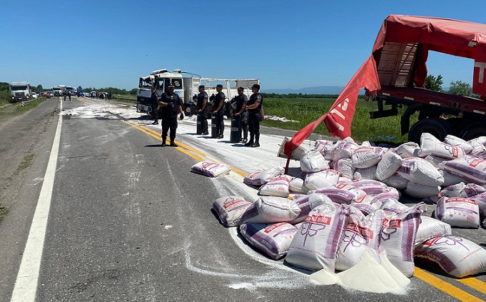 El camión volcó y la carga perteneciente al ingenio Santa Bárbara quedó esparcida en el pavimento.