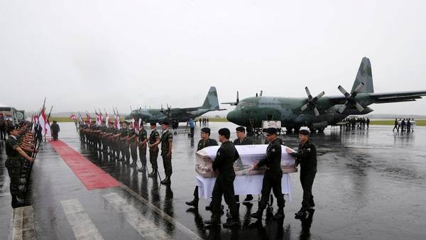 Los aviones Hércules de la Fuerza Aérea brasileña que habían partido desde Medellín y habían hecho una escala en Manaos para cargar combustible aterrizaron poco a las 9.40 en el aeropuerto. Allí los restos de 51 de las víctimas eran esperados por el presidente de Brasil, Michel Temer, quien participó de la ceremonia que acompañó el descenso de los féretros desde la aeronave.