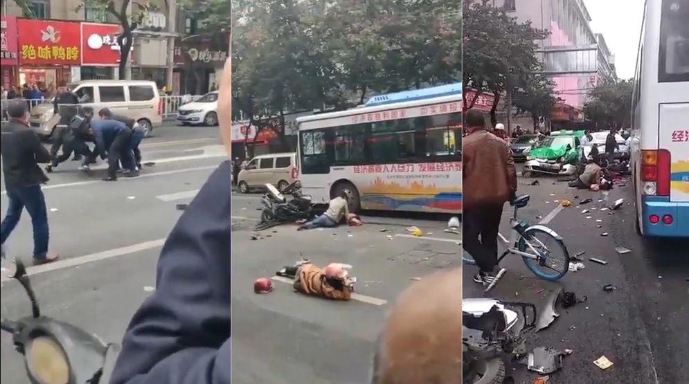 Videos difundidos en las páginas web de los medios Caixin y Global Times muestran un autobús vacío y dañado parado en medio de una avenida. Varios cuerpos sin vida yacen en el suelo alrededor del vehículo, mientras que los agentes controlan a un hombre ante los ojos de varios curiosos.