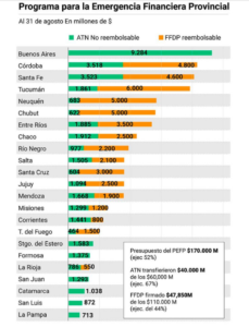 El mismo informe señala que la asistencia financiera a las provincias en el marco de la pandemia contempló una asignación de recursos por $120.000 millones provenientes del Fondo de Aportes del Tesoro Nacional (ATN), así como del Fondo Fiduciario para el Desarrollo Provincial.