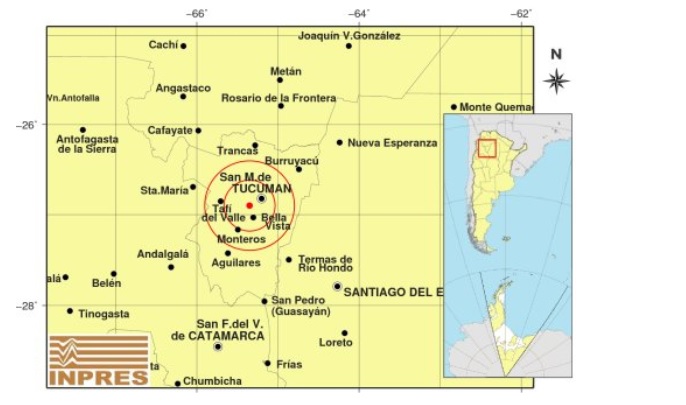 El epicentro de este fenómeno fue a 17 km al SO de San Miguel De Tucumán; 146 km al NO de Santiago Del Estero; 15 km al N de Bella Vista -26.900 (lat) -65.350 (long) y ocurrió a las 14:57:04 según informó el organismo nacional y tuvo una profundidad de 10 kilómetros.