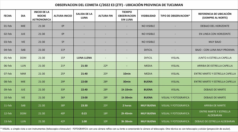 En ese sentido pregunta y luego sostiene: “¿Cómo intentar observarlo? Les comparto una tabla que preparé con las posibilidades de observación del cometa de los primeros días de febrero hasta el día 13”.