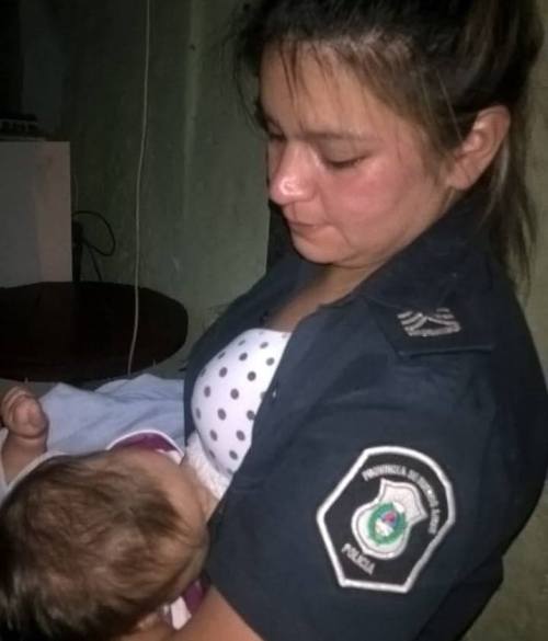 La Sargento Micaela Mongiano amamantó tomó al pequeño en sus brazos y como si fuera su propio hijo lo colocó sobre su pecho para darle de mamar y así calmar su llanto.