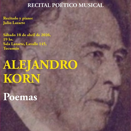 - “Poemas”, de Alejandro Korn. A las 19, en la Sala Lazarte, Lavalle 145 de la ciudad de San Miguel de Tucumán. Recitado y piano: Maestro Julio Lazarte.