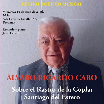 - “Sobre el rastro de la copla: Santiago del Estero”, de Álvaro Ricardo Caro. A las 20, en la Sala Lazarte, Lavalle 145 de la ciudad de San Miguel de Tucumán. Recitado y piano: Maestro Julio Lazarte.