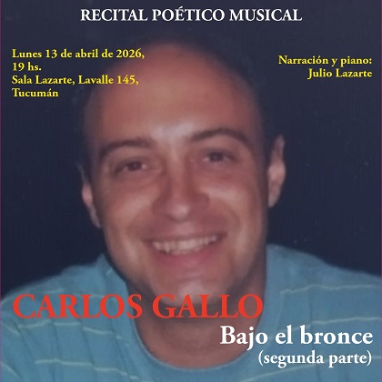 - “Bajo el bronce” (Segunda parte), de Carlos Gallo. A las 19, en la Sala Lazarte, Lavalle 145 de la ciudad de San Miguel de Tucumán. Narración y piano: Maestro Julio Lazarte.
