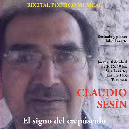 - “El signo del crepúsculo”, de Claudio Sesín. A las 19, en la Sala Lazarte, Lavalle 145 de la ciudad de San Miguel de Tucumán. Recitado y piano: Maestro Julio Lazarte.