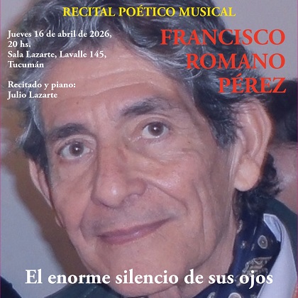 - “El enorme silencio de sus ojos”, de Francisco Romano Pérez. A las 20, en la Sala Lazarte, Lavalle 145 de la ciudad de San Miguel de Tucumán. Recitado y piano: Maestro Julio Lazarte.