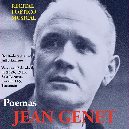 - “Poemas”, de Jean Genet. A las 19, en la Sala Lazarte, Lavalle 145 de la ciudad de San Miguel de Tucumán. Recitado y piano: Maestro Julio Lazarte.