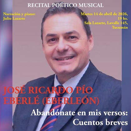 - “Abandónate en mis versos: cuentos breves”, de José Ricardo Pío Eberle (Eberleón). A las 19, en la Sala Lazarte, Lavalle 145 de la ciudad de San Miguel de Tucumán. Narración y piano: Maestro Julio Lazarte.