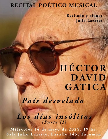 - “País desvelado. Los días insólitos” (Parte II), de Héctor David Gatica. A las 19, en la Sala Lazarte, de Lavalle 145, en San Miguel de Tucumán. Recitado y piano: Maestro Julio Lazarte.