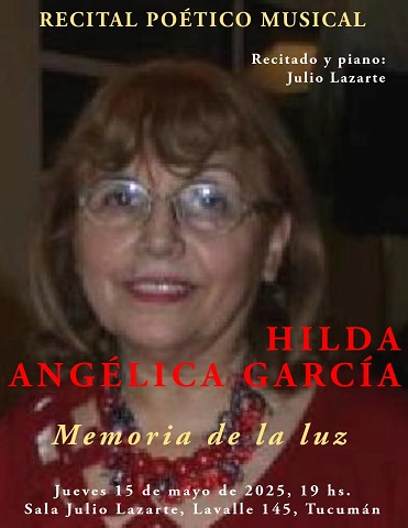 - “Memoria de la luz”, de Hilda Angélica García. A las 19, en la Sala Lazarte, de Lavalle 145, en San Miguel de Tucumán. Recitado y piano: Maestro Julio Lazarte.