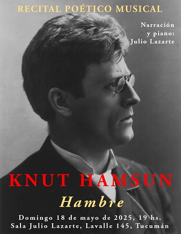 - Ciclo de los Premios Nobel. “Hambre”, de Knut Hamsun. A las 19, en la Sala Lazarte, de Lavalle 145, en San Miguel de Tucumán. Narración y piano: Maestro Julio Lazarte.