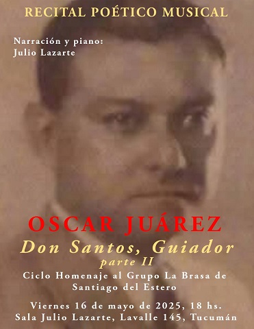 - Ciclo Homenaje al Grupo La Brasa de Santiago del Estero. “Don Santos, guiador” (Parte II), de Oscar Juárez. A las 19, en la Sala Lazarte, de Lavalle 145, en San Miguel de Tucumán. Narración y piano: Maestro Julio Lazarte.