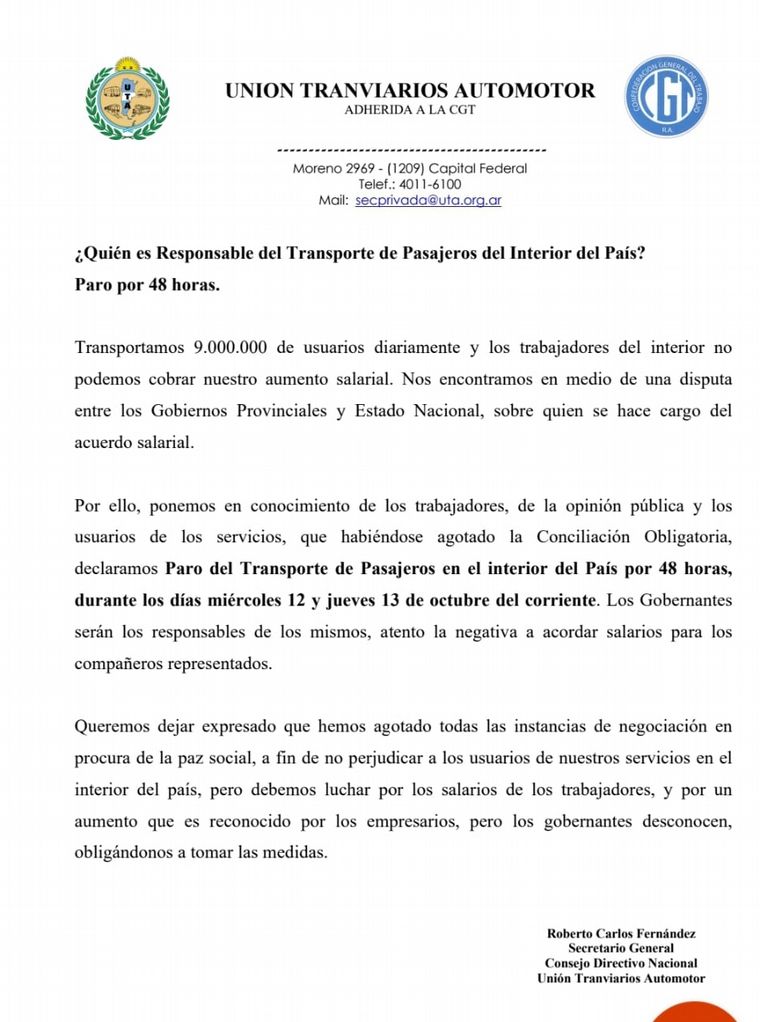 Además, el comunicado, firmado por el Secretario General de UTA, Roberto Carlos Fernández, amplía: “Hemos agotado todas las instancias de negociación en procura de la paz social, a fin de no perjudicar a los usuarios de nuestros servicios en el interior del país, pero debemos luchar por el salario de los trabajadores, y por un aumento que es reconocido por los empresarios, pero los gobernantes desconocen, obligándonos a tomar las medidas”.