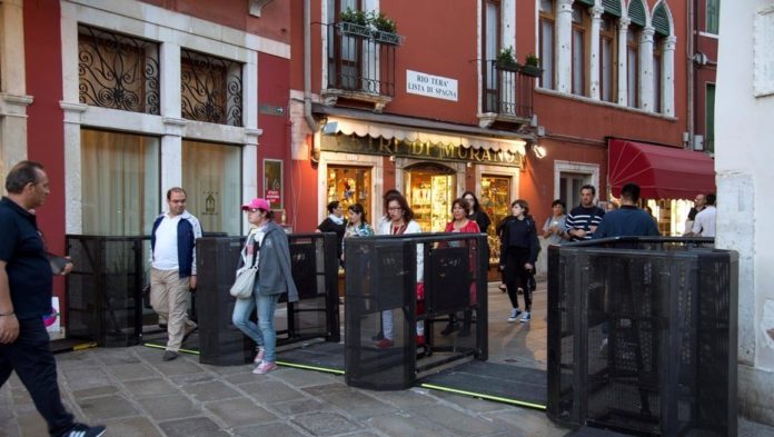 Venecia instaló un sistema de molinetes o compuertas para controlar el ingreso de turistas en puntos clave de la ciudad, mecanismo que comenzará a funcionar este fin de semana largo hasta el 1ro de mayo, cuando se prevé una gran afluencia de visitantes.