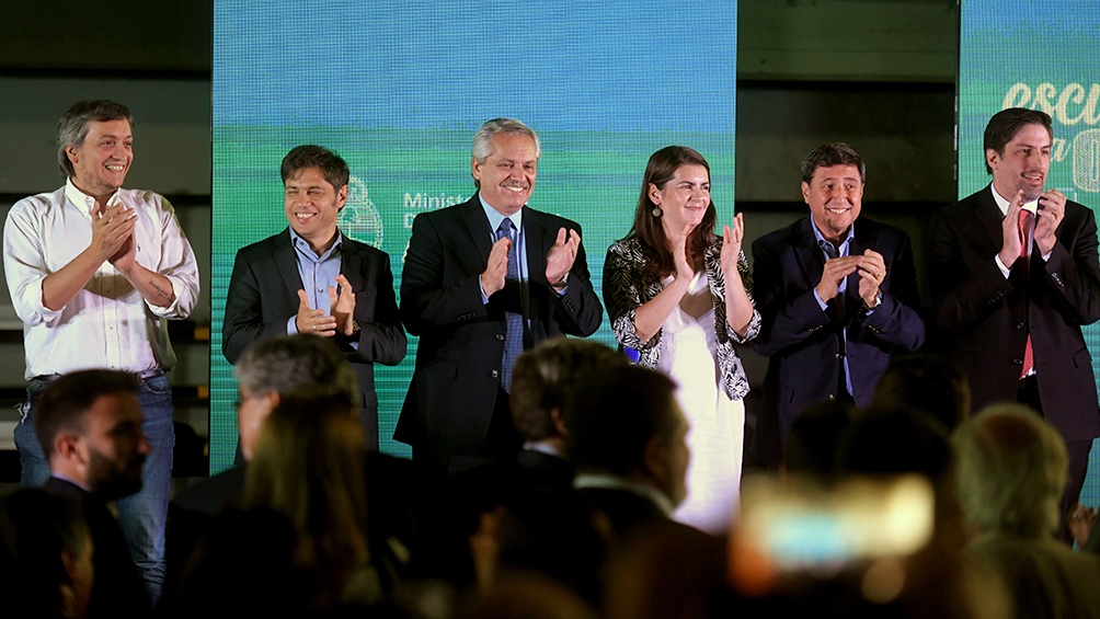 En el escenario, acompañaron a Fernández los ministros de Educación, Nicolás Trotta; Interior, Eduardo De Pedro; y Desarrollo Social, Daniel Arroyo; el jefe del bloque de diputados nacionales del Frente de Todos, Máximo Kirchner; y la intendenta Mariel Fernández.