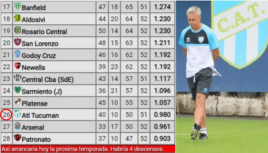 El lote de más complicados lo completan Atlético Tucumán (1.093), Sarmiento de Junín (1.096), Central Córdoba de Santiago del Estero (1.106) y Arsenal de Sarandí (1.118). De ellos, el único que divide por dos temporadas es el equipo dirigido por Israel Damonte, que peleó hasta la última jornada por ingresar a los Playoffs de esta Copa de la Liga Profesional.