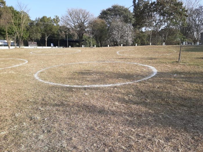 Las autoridades señalaron que los vecinos que quieran compartir con sus familias deberán ubicarse dentro de los círculos pintados en el suelo, que están distribuidos para evitar el contacto con otras familias y evitar la propagación de coronavirus.